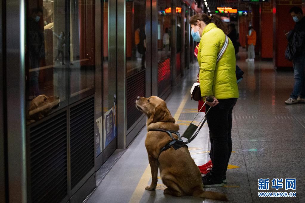 導(dǎo)盲犬“多多”陪伴祝愛(ài)葉在地鐵站內(nèi)準(zhǔn)備乘坐地鐵(3月13日攝)?! ⌒氯A社發(fā) (張夢(mèng) 攝)