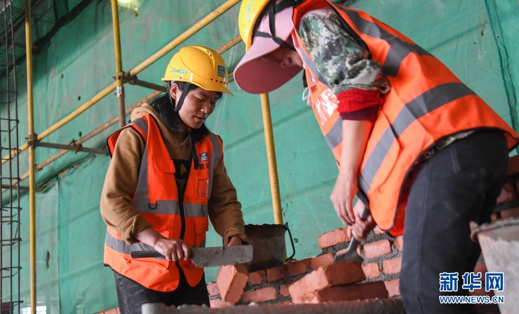 4月28日,姐姐蔡明梅(右)和妹妹蔡明娥在武漢湖北廣電傳媒基地項目工地上搭檔施工。