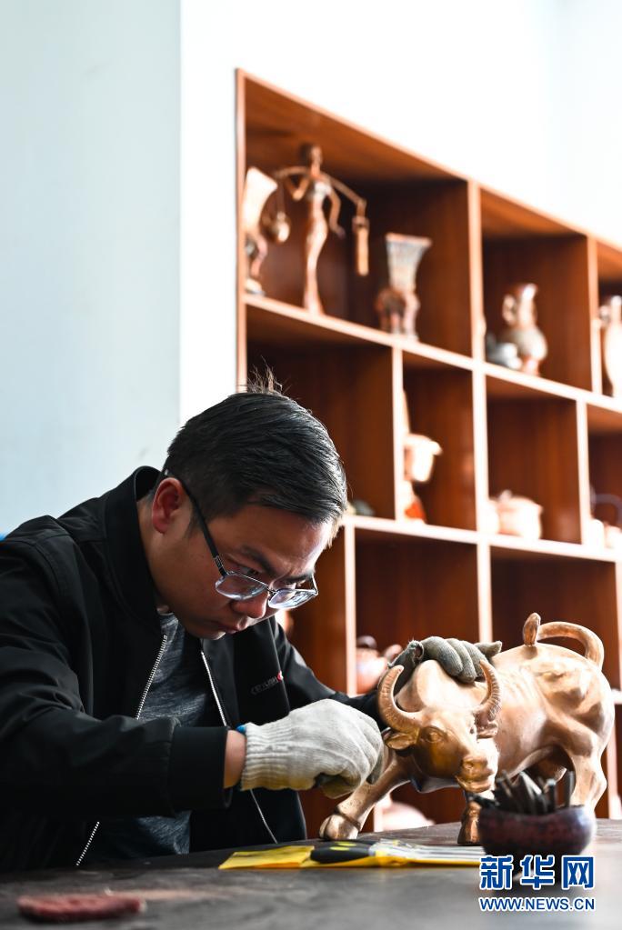 地處滇東北、烏蒙山腹地的云南會澤縣流傳著具有300多年歷史的斑銅制作工藝。斑銅工藝復(fù)雜,要采用高品位的銅為原料,經(jīng)過20余道工序制作而成。產(chǎn)品“妙在有斑,貴在渾厚”,風格獨樹一幟。33歲的張偉是會澤“張氏斑銅”的第十三代傳人。自幼深受地域文化和家庭熏陶的他,大學畢業(yè)后,返鄉(xiāng)從事斑銅制作工作。在會澤古城的“銅匠街”,張偉創(chuàng)辦了斑銅傳習館,不斷研發(fā)斑銅新產(chǎn)品、傳承著這項非遺技藝?!鞍咩~是一種情感、一種文化,希望在我們這代人的努力下能夠更好地將它傳承下去,讓更多人了解斑銅的獨特魅力?!睆垈フf。