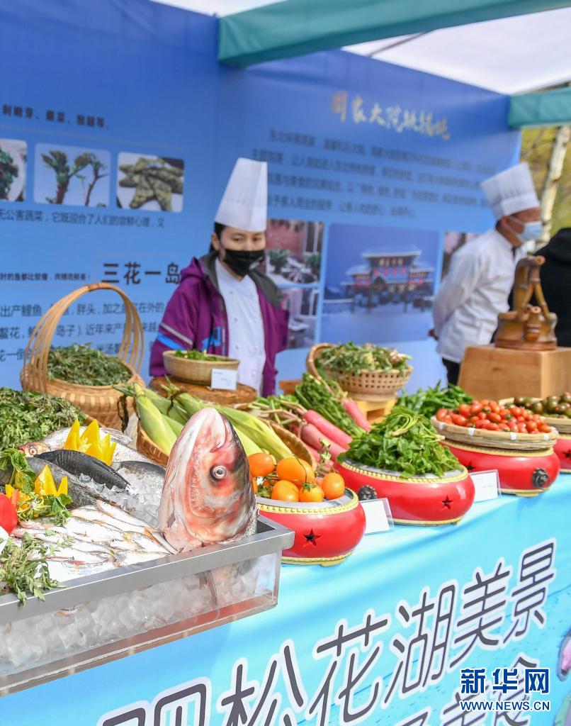 5月1日,在吉林市萬(wàn)科松花湖度假區(qū)夏季運(yùn)營(yíng)啟幕儀式現(xiàn)場(chǎng),廚師展示開(kāi)江魚(yú)和山野菜等當(dāng)?shù)靥厣朗场?/p>