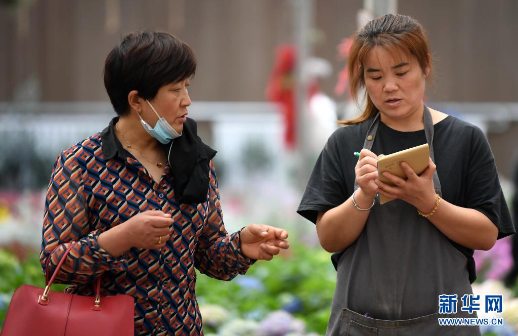 5月7日,在秦嶺花世界現(xiàn)代農(nóng)業(yè)園區(qū),銷(xiāo)售人員在給顧客計(jì)算花卉價(jià)格。