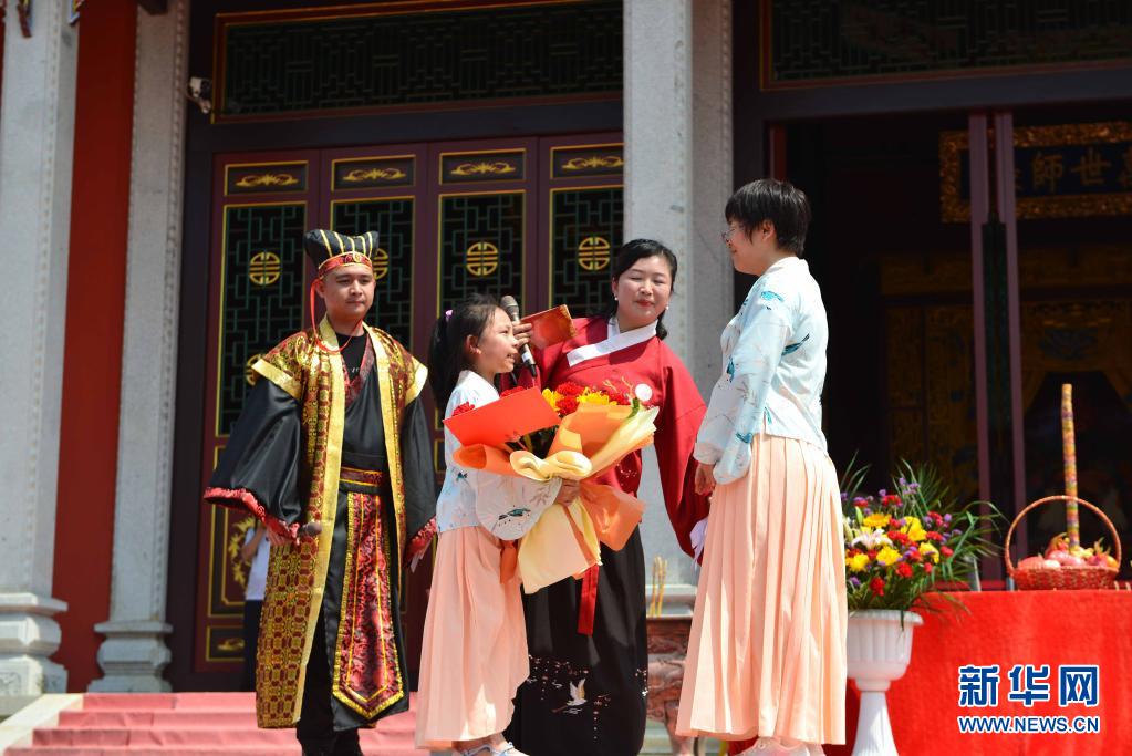 5月9日,在廣西賀州市八步區(qū)賀街鎮(zhèn)的賀州文廟國學教育基地,一名小女孩在母親節(jié)“孝行天下”活動中向母親獻花。