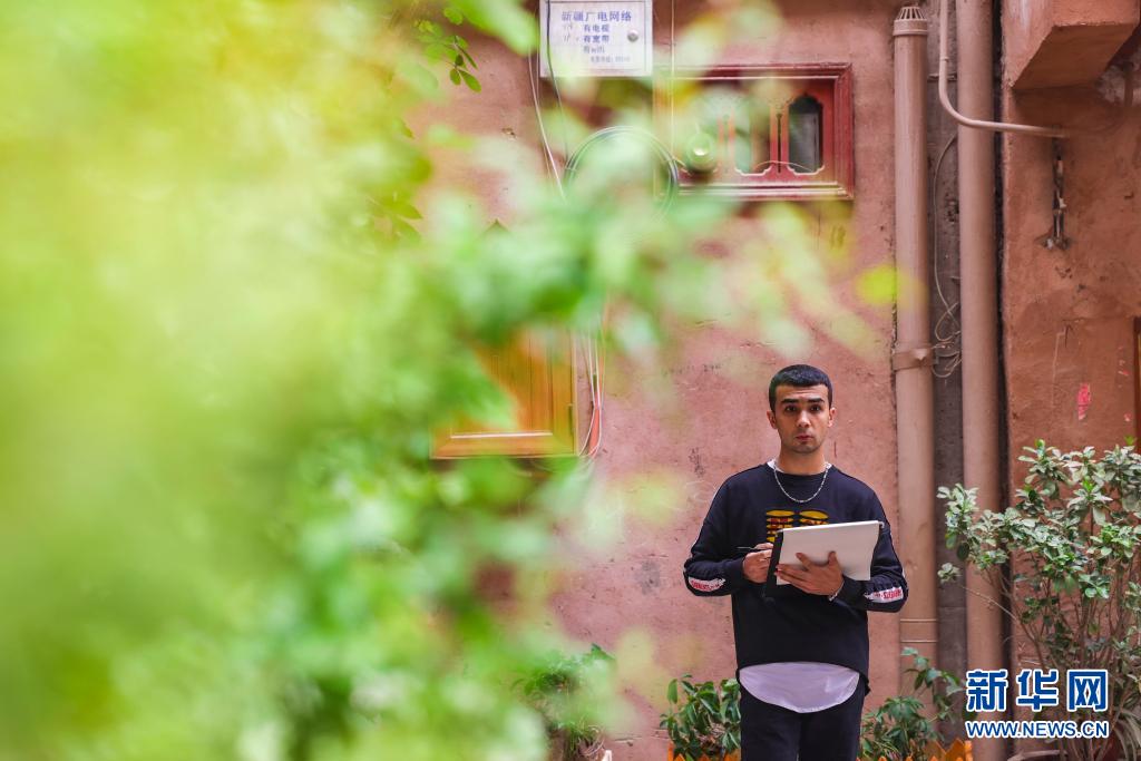 麥麥提吐爾遜江·麥麥提依明在新疆喀什古城景區(qū)的小巷內(nèi)進行速寫創(chuàng)作(5月6日攝)。新華社記者 胡虎虎 攝