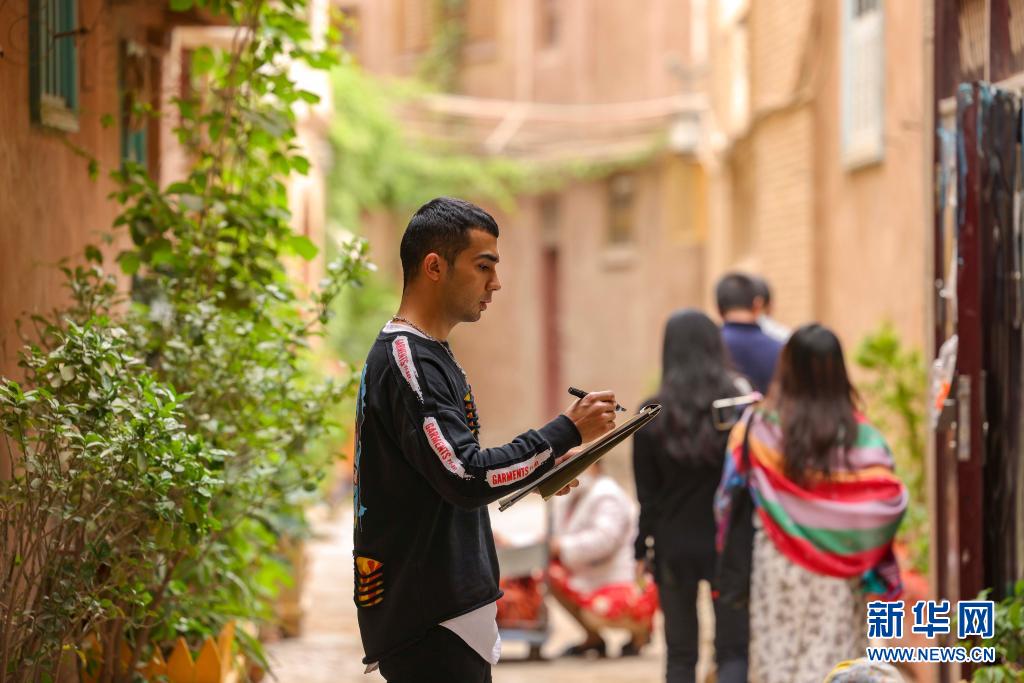 麥麥提吐?tīng)栠d江·麥麥提依明在新疆喀什古城景區(qū)的小巷內(nèi)進(jìn)行速寫創(chuàng)作,游客從他身旁走過(guò)(5月6日攝)。新華社記者 胡虎虎 攝
