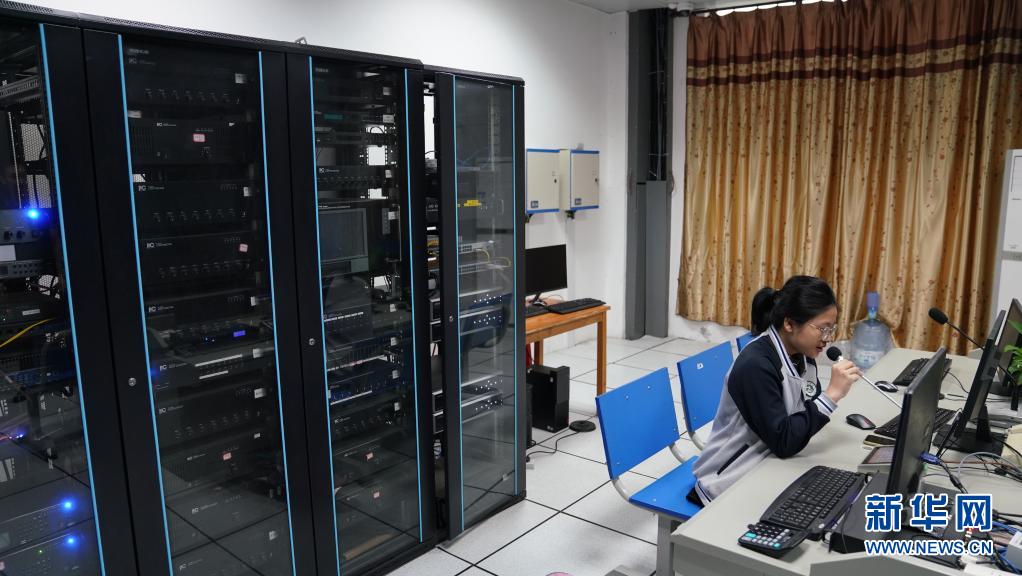 2021年5月11日,蔣張子怡在學(xué)校的廣播站進行播音。