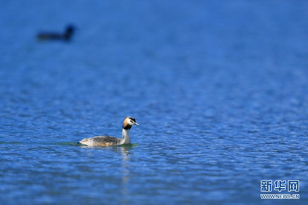 6月14日在拉魯濕地拍攝的鳳頭??。夏日里,鳳頭??和小??在西藏拉薩拉魯濕地國家級(jí)自然保護(hù)區(qū)水面上嬉戲。新華社記者 張汝鋒 攝