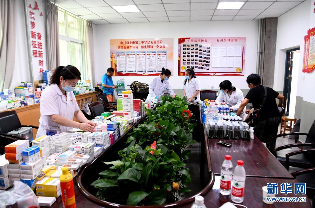 這是7月25日在河南省新鄉(xiāng)市第二中學(xué)安置點(diǎn)拍攝的臨時(shí)醫(yī)療救助點(diǎn)。