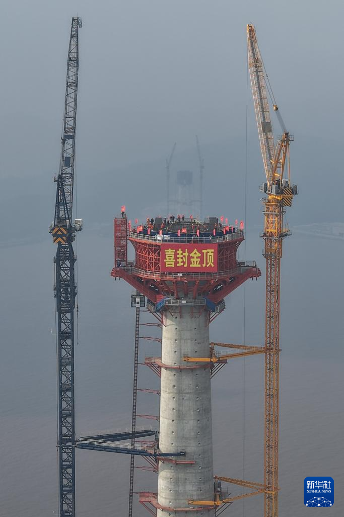12月30日拍摄的甬舟铁路西堠门公铁两用大桥5号主塔封顶现场(无人机照片)。