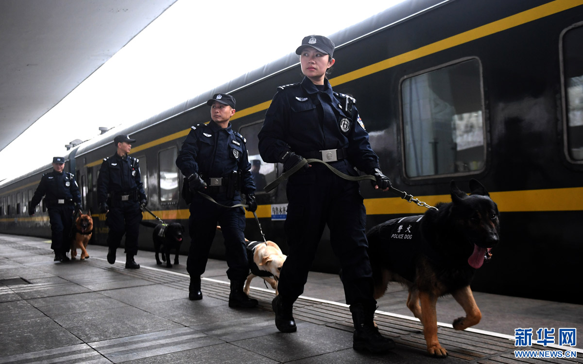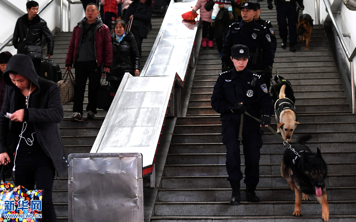 2月5日,劉慧(前)帶著“威利”和隊(duì)友在襄陽火車站巡邏。新華社記者 程敏 攝