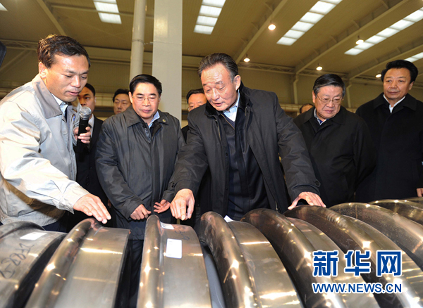 ????11月19日至23日,全國人大常委會委員長吳邦國在山西調(diào)研。這是11月20日,吳邦國在太原重工集團(tuán)高速輪對國產(chǎn)化項目現(xiàn)場詳細(xì)了解工藝流程和技術(shù)指標(biāo)。 新華社記者 李濤 攝