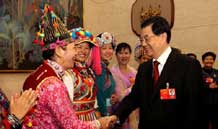 胡錦濤等黨和國家領(lǐng)導(dǎo)人走進(jìn)會場,來到身著民族盛裝的少數(shù)民族代表、委員們中間,同大家親切握手,互致問候。