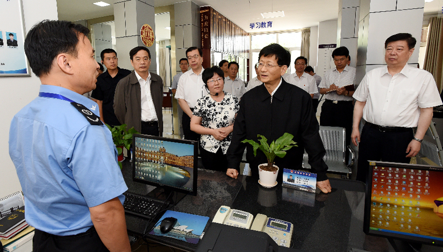 6月13日至17日,中共中央政治局委員、中央政法委書記孟建柱在山東調研。圖為6月13日,孟建柱來到曲阜市司法局社區(qū)矯正管理中心調研。