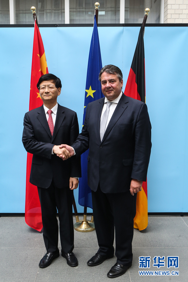 ?? ?6月29日,習近平主席特使、中共中央政治局委員、中央政法委書記孟建柱(左)在德國首都柏林會見德國副總理兼經(jīng)濟和能源部長加布里爾。新華社記者張帆攝