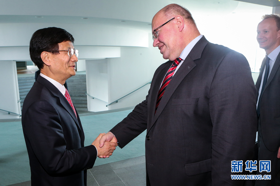 ??? 6月29日,習(xí)近平主席特使、中共中央政治局委員、中央政法委書記孟建柱(左)在德國首都柏林會見德國總理府部長阿爾特邁爾。新華社記者張帆攝