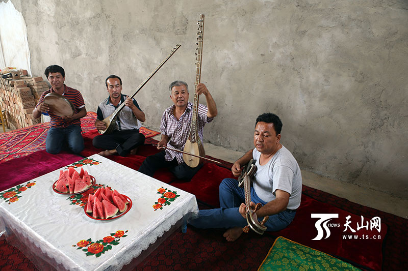 2013年以來,鄯善縣拿出資金,在全縣每個(gè)自然村建立農(nóng)民“文化大院”,給農(nóng)民提供文化娛樂的場所,十二木卡姆也自然成為大院里必備的節(jié)目,老藝人們忙碌了不少。最近正值齋月期間,村民間的文化活動照舊開展,蘇來曼 阿不都時(shí)常還要去周圍村里演出,最讓他高興的是,十二木卡姆這門古老的藝術(shù),在今天依舊被大家重視和喜愛,這一點(diǎn)對于他來說,比金錢更重要?!爸灰蠹疫€喜歡十二木卡姆,在平日里能見到它,它的傳承和發(fā)展就有不竭動力?!?蘇來曼 阿不都說。
