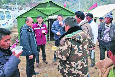 王海(左三)在吉隆鎮(zhèn)災區(qū)布置工作。資料照片