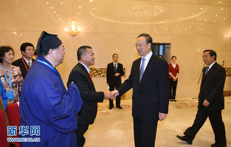 ?? 9月4日,紀念中國人民抗日戰(zhàn)爭暨世界反法西斯戰(zhàn)爭勝利70周年宗教界和平祈禱活動在北京舉行。這是中共中央書記處書記、全國政協副主席杜青林,全國政協副主席齊續(xù)春會見參加和平祈禱活動的宗教界代表。新華社記者 張領 攝