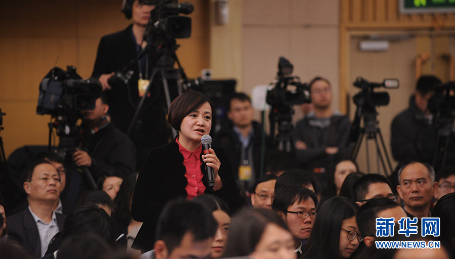 ?????十二屆全國人大四次會議新聞中心于3月12日(星期六)14時30分在梅地亞中心多功能廳舉行記者會,邀請國務院國有資產監(jiān)督管理委員會主任肖亞慶、副主任張喜武、副主任黃丹華和副秘書長、新聞發(fā)言人彭華崗就“國企改革”的相關問題回答中外記者的提問。圖為中央電視臺記者提問。新華網/中國政府網 陳杰 攝