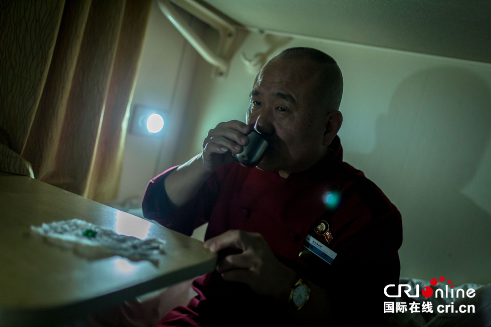 晚上11點(diǎn)多,大部分旅客已進(jìn)入夢(mèng)鄉(xiāng),白振慶師傅終于可以回到休息室稍作調(diào)整,但只能小睡幾個(gè)小時(shí),凌晨4點(diǎn)白師傅還要起來(lái)為旅客準(zhǔn)備早飯。白師傅血壓偏高,每天晚上都要吃藥進(jìn)行控制。