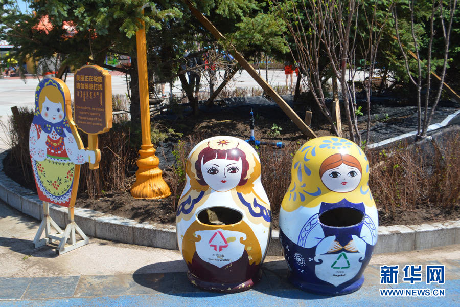 滿洲里市套娃景區(qū),連垃圾箱也是套娃模樣(6月23日)。新華網(wǎng)記者 張敏彥 攝