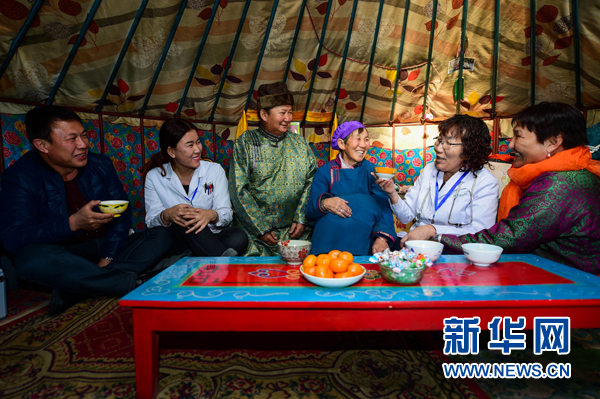 家庭責(zé)任醫(yī)務(wù)人員與阿巴嘎旗牧民道力格爾瑪一家拉家常(2月20日攝)。為緩解牧民看病難問題,從2013年起,阿巴嘎旗給超出衛(wèi)生院服務(wù)半徑10公里的每戶牧民配備小藥箱,安排家庭責(zé)任醫(yī)生,還購買了12臺內(nèi)置B超機、心電圖機、尿液分析儀等醫(yī)療設(shè)備的流動服務(wù)車。新華社記者 連振 攝
