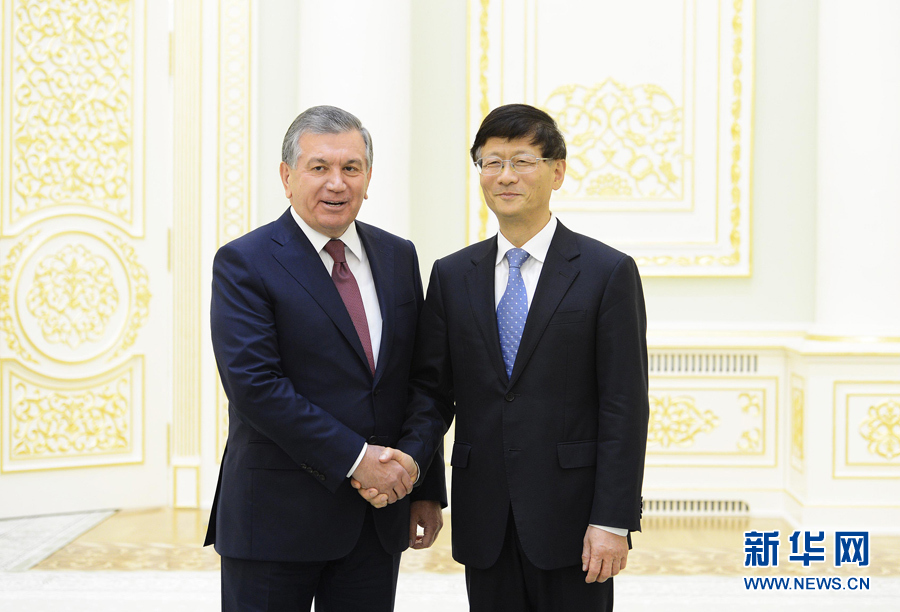 9月9日,中共中央政治局委員、中央政法委書記、中國(guó)和烏茲別克斯坦政府間合作委員會(huì)中方主席孟建柱(右)在塔什干會(huì)見(jiàn)烏總統(tǒng)米爾濟(jì)約耶夫。 新華社記者沙達(dá)提攝