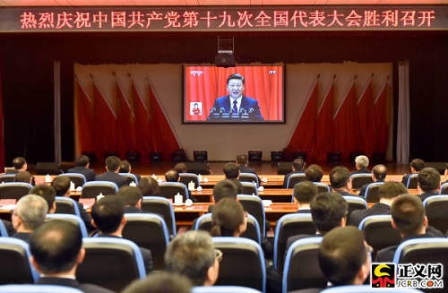 中國(guó)共產(chǎn)黨第十九次全國(guó)代表大會(huì)18日上午在人民大會(huì)堂開(kāi)幕。習(xí)近平總書(shū)記代表第十八屆中央委員會(huì)向大會(huì)作了題為《決勝全面建成小康社會(huì) 奪取新時(shí)代中國(guó)特色社會(huì)主義偉大勝利》的報(bào)告。最高檢人民檢察院機(jī)關(guān)(八大處辦公區(qū))黨員干部集體收看收聽(tīng)了開(kāi)幕式。張哲攝