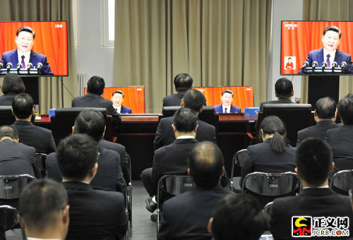 中國(guó)共產(chǎn)黨第十九次全國(guó)代表大會(huì)18日上午在人民大會(huì)堂開(kāi)幕。習(xí)近平總書(shū)記代表第十八屆中央委員會(huì)向大會(huì)作了題為《決勝全面建成小康社會(huì) 奪取新時(shí)代中國(guó)特色社會(huì)主義偉大勝利》的報(bào)告。國(guó)家檢察官學(xué)院黨員干部集體收看收聽(tīng)了開(kāi)幕式。徐鵬宇攝