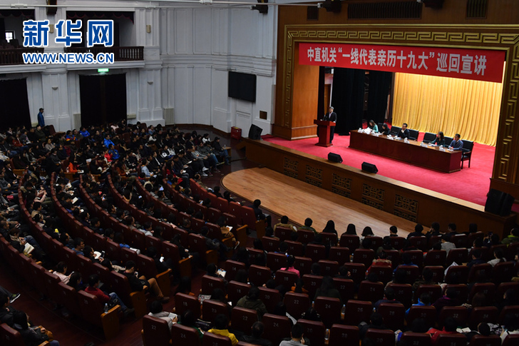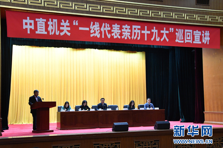 中直機(jī)關(guān)“一線代表親歷十九大”巡回宣講第三場報(bào)告會(huì)現(xiàn)場。新華社記者 徐速繪 攝