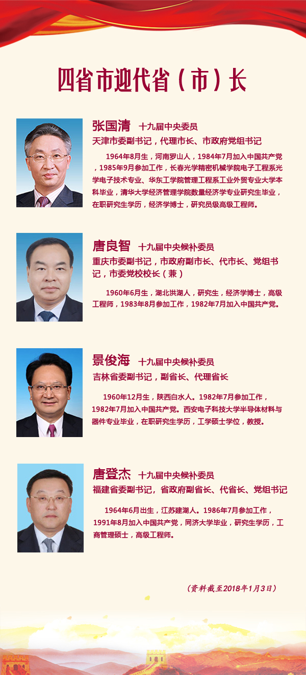 1月2日,天津、重慶、吉林、福建四省市調(diào)整政府“一把手”。其中,重慶市委副書記、市長張國清調(diào)任天津市委副書記、代市長;重慶市委副書記唐良智擔任重慶市代市長;北京市委副書記景俊海調(diào)任吉林省委副書記、代省長;工信部副部長、國家航天局局長唐登杰出任福建省委副書記、代省長。
