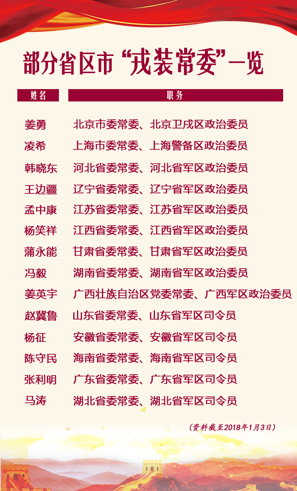 2017年12月30日,上海警備區(qū)政治委員凌希任上海市委委員、常委,河北省軍區(qū)政治委員韓曉東履新河北省委委員、常委。由此,上海、河北成為首批增補“戎裝常委”的省份。