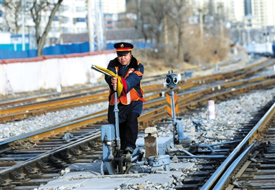 2月8日,門頭溝站扳道工張軍在從事扳道工作。記者 王貴彬 攝