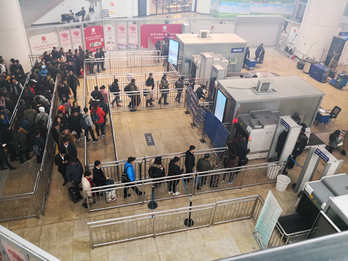 在一個火車站安檢口,排起的長龍和閑置的安檢通道形成鮮明對比