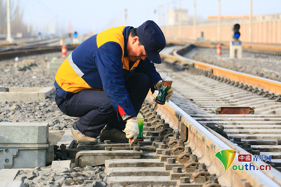 農(nóng)歷正月初八這天,邰芳鵬和工區(qū)3名年輕職工一同到現(xiàn)場,對阿克蘇站信號機(jī)和道岔進(jìn)行巡視檢查。中國青年網(wǎng)通訊員 姚旭東 攝