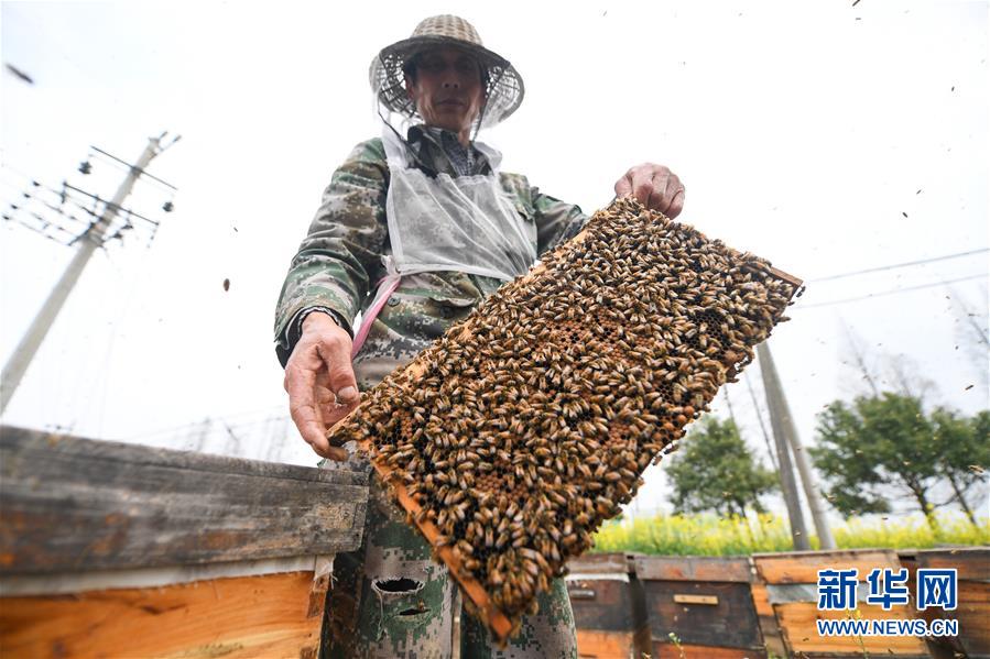 3月14日,來自安徽的蜂農在湖北省潛江市龍灣鎮(zhèn)的油菜花地里放養(yǎng)蜜蜂。早春時節(jié),湖北省潛江市20多萬畝油菜花長勢好、流蜜足,來自全國各地的400多名養(yǎng)蜂專業(yè)戶在此收獲“甜蜜”。 新華社發(fā)(吳燕軍 攝)