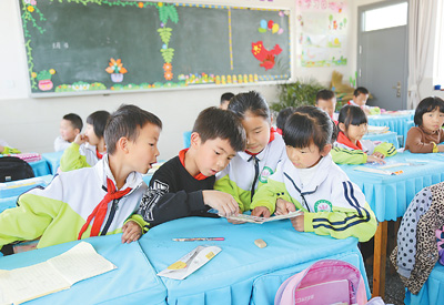 吉花小學(xué)一年級(jí)學(xué)生利用中午時(shí)間一起做作業(yè)。李發(fā)興 攝