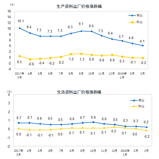 2018年3月份,全國(guó)工業(yè)生產(chǎn)者出廠價(jià)格同比上漲3.1%,環(huán)比下降0.2%。工業(yè)生產(chǎn)者購(gòu)進(jìn)價(jià)格同比上漲3.7%,環(huán)比下降0.3%。一季度,工業(yè)生產(chǎn)者出廠價(jià)格同比上漲3.7%,工業(yè)生產(chǎn)者購(gòu)進(jìn)價(jià)格同比上漲4.4%。