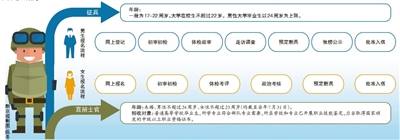 男青年應(yīng)征需經(jīng)過網(wǎng)上登記、初審初檢、體檢政審、走訪調(diào)查、預(yù)定新兵、張榜公示、批準(zhǔn)入伍7個(gè)環(huán)節(jié)。