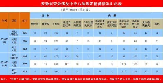 今年1至3月,安徽省共查處違反中央八項(xiàng)規(guī)定精神問題544個(gè),處理749人,給予黨紀(jì)政務(wù)處分553人。
