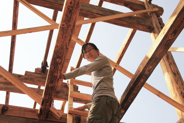潘曦在云南納西族地區(qū)大木作現(xiàn)場(chǎng)考察木構(gòu)架節(jié)點(diǎn)做法。圖片由受訪者提供