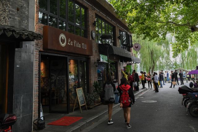 游客從“初心”咖啡館的門(mén)前經(jīng)過(guò)??拷贾菽仙铰返摹俺跣摹笨Х瑞^以前是“東籬會(huì)所”,如今成了別有風(fēng)味的大眾咖啡館。新華社記者 黃宗治 攝