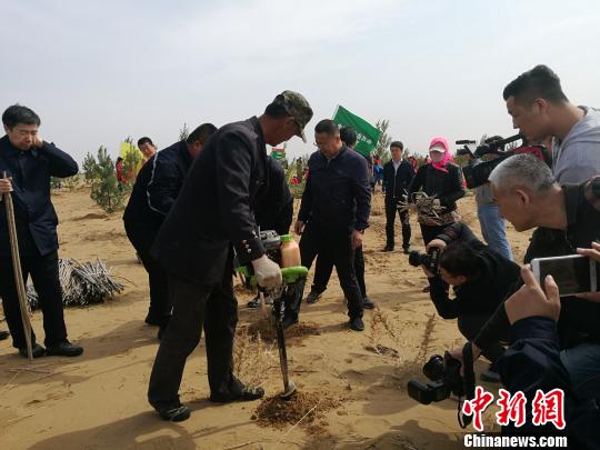 圖為在庫(kù)布其沙漠上舉行的“大型義務(wù)植樹活動(dòng)”現(xiàn)場(chǎng)。李愛平 攝
