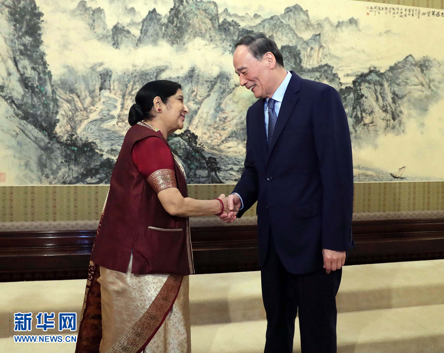 4月23日,國家副主席王岐山在北京中南海會見印度外長斯瓦拉杰。新華社記者劉衛(wèi)兵攝