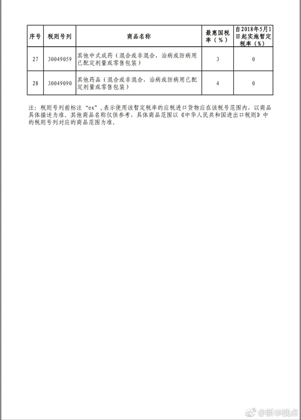 新華網(wǎng)北京4月23日電 財(cái)政部關(guān)稅司23日發(fā)布消息,5月1日起我國(guó)將取消包括抗癌藥在內(nèi)的28項(xiàng)藥品進(jìn)口關(guān)稅。調(diào)整后,除安宮牛黃丸等我國(guó)特產(chǎn)藥品、部分生物堿類藥品等少數(shù)品種外,絕大多數(shù)進(jìn)口藥品,特別是有實(shí)際進(jìn)口的抗癌藥均將實(shí)現(xiàn)零關(guān)稅。(記者郁瓊源) ????(據(jù)新華社“新華視點(diǎn)”微博報(bào)道)?