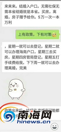 4月22日晚,海南省政府召開《中共海南省委辦公廳海南省人民政府辦公廳關(guān)于進一步穩(wěn)定房地產(chǎn)市場的通知》新聞發(fā)布會,公布全省實施全域限購。隨即,朋友圈流傳“星期一登記結(jié)婚、星期二辦理海南戶口、星期三買房、星期四登記(結(jié)婚)、星期五打(假結(jié)婚)手續(xù)費、下周一離婚”等傳言和段子。南海網(wǎng)記者從海南省公安廳、海口市民政局等部門了解到,此類登記結(jié)婚就可立即辦理落戶海南等傳言均不可能實現(xiàn)。