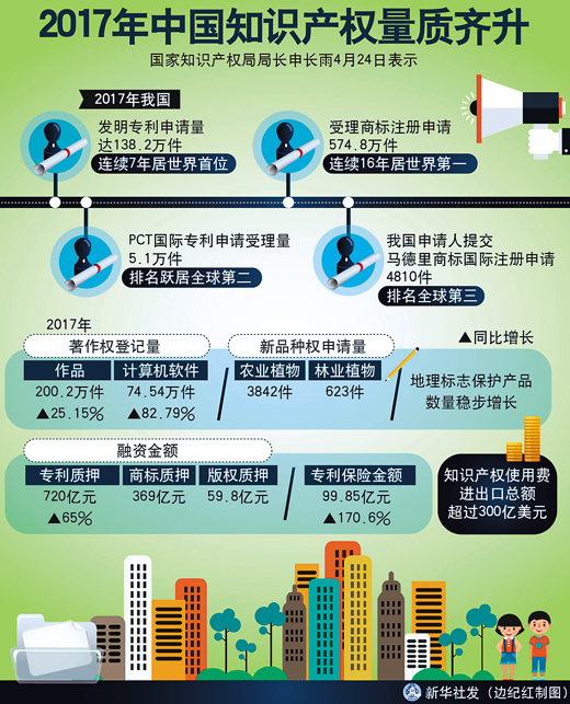 隨著中國經(jīng)濟(jì)迅速發(fā)展和創(chuàng)新能力的提高,加強(qiáng)知識(shí)產(chǎn)權(quán)保護(hù)愈加顯得迫切。對(duì)此,不僅外資企業(yè)有要求,中國企業(yè)更有要求。2017年,中國國家知識(shí)產(chǎn)權(quán)局共受理發(fā)明專利申請(qǐng)138.2萬件,其中國內(nèi)申請(qǐng)超過90%;商標(biāo)申請(qǐng)量達(dá)到574.8萬件,其中國內(nèi)申請(qǐng)量占到96.36%,顯示了國內(nèi)市場(chǎng)主體和創(chuàng)新主體對(duì)加強(qiáng)知識(shí)產(chǎn)權(quán)保護(hù)的強(qiáng)烈需求。