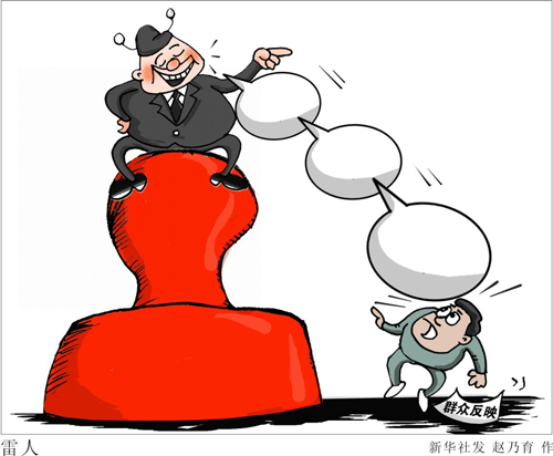 其二,遮丑關(guān)?!凹页蟛豢赏鈸P(yáng)”思維作祟,怕違法亂紀(jì)行為曝光影響地方形象而護(hù)短、包庇。在不少侵害群眾利益的行為中,一些政府部門或多或少充當(dāng)了幫兇。只要群眾忍氣吞聲,這些行為就不了了之。一旦群眾投訴引發(fā)輿論關(guān)注,當(dāng)?shù)卣ε缕毓庥绊懙胤叫蜗笊踔痢盀跫喢薄?,就派出各路人馬“游說”。這些干部接待上訪群眾時(shí)先表示同情和理解,再以“大局意識(shí)”進(jìn)行說教,最終提出賠錢了事。一旦“說不通”,就“放狠話”“玩拖延”,甚至威脅。