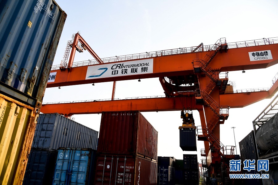 占地1800畝的中鐵聯(lián)集青島中心站內(nèi),藍(lán)色、白色的集裝箱把場站裝點成一片“集裝箱海洋”;橫穿場站的兩條鐵軌旁,數(shù)座巨型龍門吊繁忙作業(yè),來自海上的貨物被搬運至將遠(yuǎn)行的國際班列上……