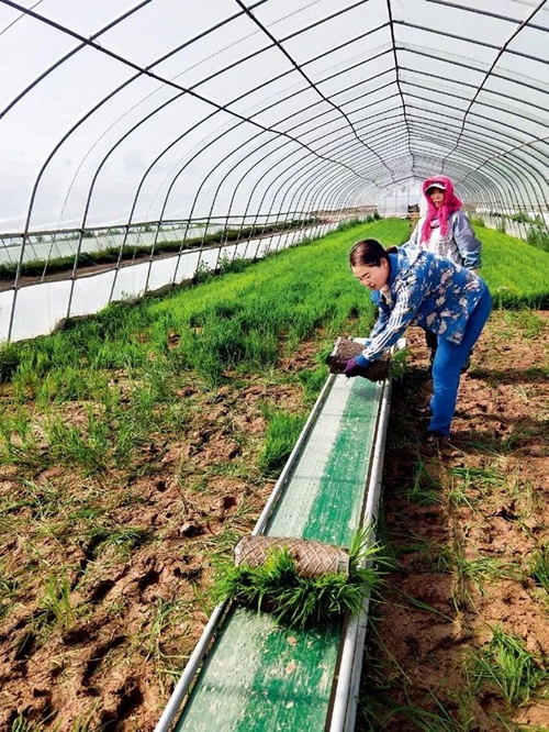 農(nóng)科大學生呂永杰在寧夏廣銀米業(yè)公司育苗基地移植水稻秧苗