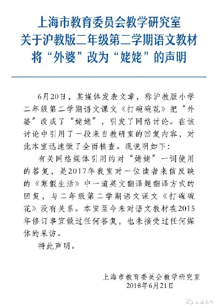 上海市教育委員會(huì)教學(xué)研究室表示,有關(guān)網(wǎng)絡(luò)媒體引用的對“姥姥”一詞使用的答復(fù),是2017年教研室對一位讀者來信反映的《寒假生活》中一道英文翻譯題翻譯方式的回復(fù),與二年級第二學(xué)期語文課文《打碗碗花》沒有關(guān)系。教研室至今未對語文教材在2015年修訂事宜做過任何答復(fù),也未接受過任何媒體的采訪。